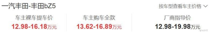 丰田bZ5售价12.98-19.98万元,目前来看,低配车型没有优惠,高配车型大约存在3.8万元的优惠,这样一来,高低配之间的价格差异就不明显了,如果购车预算不是很局促的话,还是建议选择高配车型。
